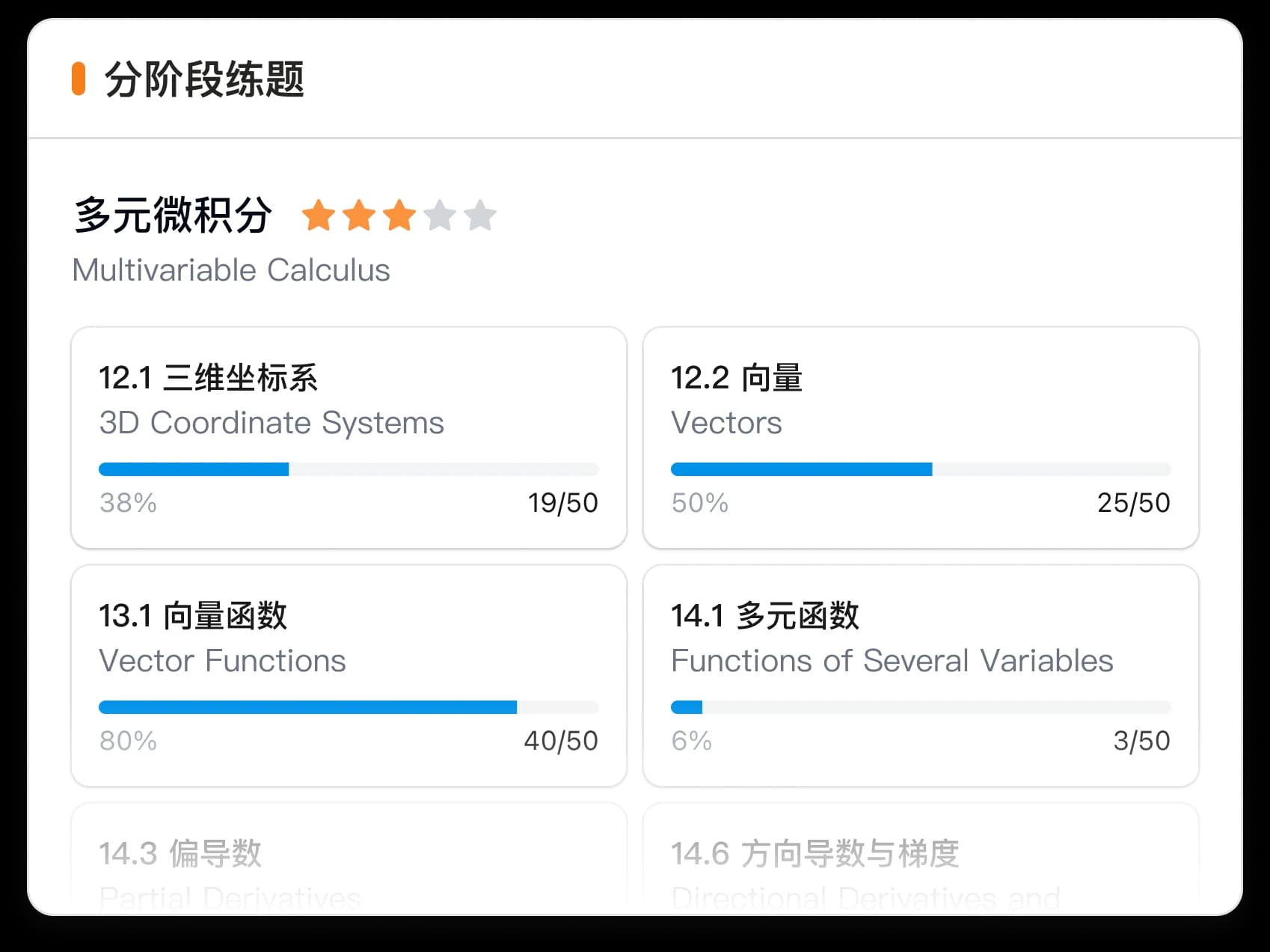 循序渐进,稳步提升,精确到每道题的完成状态,生成个性化学习计划。